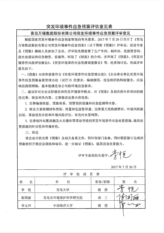 青岛ballbet贝博集团肉类食品公司 突发环境事件应急预案评估意见表公示
